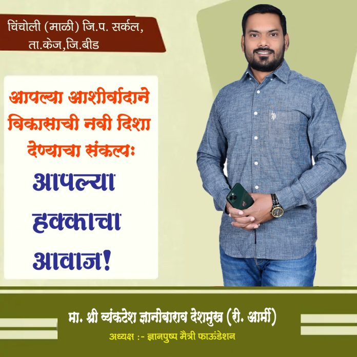 केज तालुक्यातील चिचोंली (माळी) जिल्हा परिषद सर्कल मधून उमेदवार म्हणून जनतेच्या मनातील नाव म्हणजे सर्व समावेशक व सामाजिक कार्यकर्ते म्हणून ज्यांची ओळख आहे असे नाव म्हणजे व्यंकटेश ज्ञानोबाराव देशमुख (माजी सैनिक)यांचे नाव बहू चर्चेत दिसत आहे कारण जनता जनार्दन या वेळेस चिचोंली जिल्हा परिषद साठी ओबीसी महिला प्रवर्ग आहे त्यामुळे नवीन चेहऱ्याला पसंती म्हणून पाहत आहे कारण गेली कित्येक वर्ष प्रस्थापित राजकीय पुढारीच या जिल्हा परिषद सर्कल चे सदस्य म्हणून निवडून आलेले आहेत. परंतु आता जनतेला कुठे वाटत आहे की विस्थापिताला व एक सर्वसामान्य शेतकऱ्याच्या लेकराला व भूमिपुत्राला न्याय मिळावा म्हणून नागरिक व्यंकटेश देशमुखांना पाहात आहेत. व्यंकटेश देशमुख हे आपल्या वडिलांचा देश सेवेचा वारसा पुढे चालवत त्यांनी ही बावीस वर्ष देश सेवा पुर्ण करून आता सेवा निवृत्त झाल्या नंतर मागील तीन वर्षापासून सर्वसामान्य गोरगरीब शेतकरी कामगार मजूर विद्यार्थी इत्यादी साठी विविध उपक्रमाच्या माध्यमातून सहकार्य मदत व मार्गदर्शन केले आहे.“वसा देश सेवेचा आता समाज सेवा” या प्रमाणे त्यांनी मागील तीन वर्षात गोरगरीब जनतेचा प्रश्नांचा पाठपुरावा करून त्यांच्या समस्या सोडवण्याचा अतोनात प्रयत्न केला आहे. एमपीएससी च्या विद्यार्थ्यांचे शैक्षणिक प्रश्न असो की स्कॉलरशिप च्या बाबतीतील प्रश्न असो त्यांनी आपल्या समाज बांधवांन सोबत शासना कडे प्रश्न उपस्थित करून त्यांना न्याय मिळवून देण्यासाठी देखील प्रयत्न केलेले आहेत.तसेच ज्ञानपुष्प मैत्री फाऊंडेशन चे अध्यक्ष म्हणून देखील त्यांनी फाउंडेशनच्या अंतर्गत देखील सामाजिक बांधिलकी जोपासत अतीवृष्टी भागात पाहणी करून गोरगरीब जनतेसाठी व शेतकरी बांधवांनसाठी किराणा कीट वाटप असो किंवा इतर उपक्रम राबवून सतत मदतीचा हात पुढे करणं असेल ते सदैव तत्पर असतात. विशेष म्हणजे व्यंकटेश देशमुख यांची उच्च शिक्षित म्हणून देखील ओळख आहे कारण त्यांनी भारतीय सेनेत सेवा देत असताना देखील आपली शैक्षणिक कारकीर्द चालूच ठेवली व बीएस्सी पदवी डॉ बाबासाहेब आंबेडकर विद्यापीठात पूर्ण करून घेतली व यशवंतराव चव्हाण मुक्त विद्यापीठात बीए पुर्ण करून ते बीएड मिलिटरी कॉलेजमधून, बर्कतुल्ला विद्यापीठ च्या अंतर्गत पूर्ण केले आहे आणि ते सद्या लॅा चे शिक्षण देखील घेत आहेत. व्यंकटेश देशमुख हे मूळचे वरपगाव चे रहिवासी असले तरी ते पुणे येथे युवा उद्योजक म्हणून देखील ओळखले जातात. त्यामुळे सध्या जिल्हा परिषद सर्कल मध्ये एकच नाव चर्चेत येत आहे कारण उच्चशिक्षित, सुशिक्षित, सामाजिक जान असलेले, शिव शाहू फुले आंबेडकरांच्या विचाराने प्रेरित असलेला निर्विवाद, निर्व्यसनी उमदा न