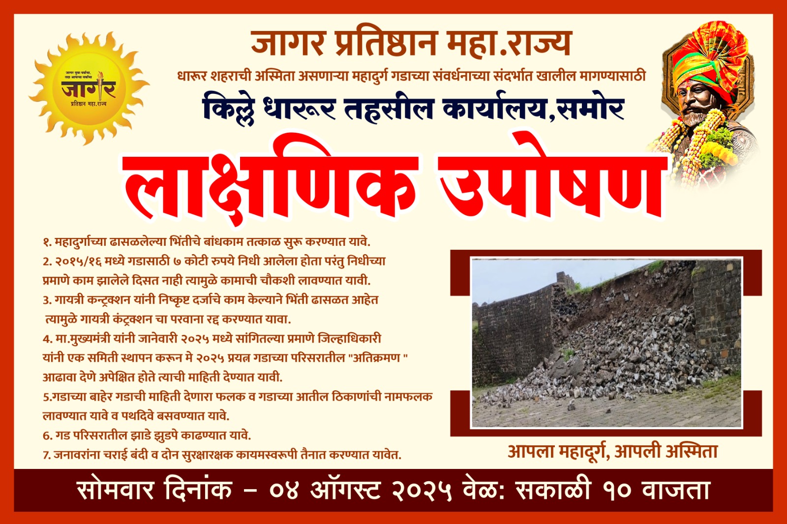 धारुर तालुक्यातील धारूर शहराची अस्मिता असणाऱ्या महादुर्ग गडाच्या संवर्धनाच्या संदर्भात खालील मागण्यासाठी किल्ले धारूर तहसील कार्यालय, समोर लाक्षणिक उपोषण जागर प्रतिष्ठानच्या वतीने करण्यात आहे व मागण्या आहेत ,महादुर्गाच्या ढासळलेल्या भिंतीचे बांधकाम तत्काळ सुरू करण्यात यावे, २०१५/१६ मध्ये गडासाठी ७ कोटी रुपये निधी आलेला होता परंतु निधीच्या प्रमाणे काम झालेले दिसत नाही त्यामुळे कामाची चौकशी लावण्यात यावी.गायत्री कन्ट्रक्शन यांनी निष्कृष्ट दर्जाचे काम केल्याने भिंती ढासळत आहेत त्यामुळे गायत्री कंट्रक्शन चा परवाना रद्द करण्यात यावा मा. मुख्यमंत्री यांनी जानेवारी २०२५ मध्ये सांगितल्या प्रमाणे जिल्हाधिकारी यांनी एक समिती स्थापन करून मे २०२५ प्रयत्न गडाच्या परिसरातील “अतिक्रमण आढावा देणे अपेक्षित होते त्याची माहिती देण्यात यावी.गडाच्या बाहेर गडाची माहिती देणारा फलक व गडाच्या आतील ठिकाणांची नामफलक लावण्यात यावे व पथदिवे बसवण्यात यावे. गड परिसरातील झाडे झुडपे काढण्यात यावे,जनावरांना चराई बंदी व दोन सुरक्षारक्षक कायमस्वरूपी तैनात करण्यात यावेत अशा विविध मागण्या साठी सोमवार दिनांक – ०४ ऑगस्ट २०२५ वेळ: सकाळी १० वाजता धारुर तहसील कार्यालया समोर लक्षणिक उपोषण करण्यात येणार आहे तरी प्रशासनाने मागण्या मान्य करुन दखल घेतली पाहिजे असे जागर प्रतिष्ठानच्या वतीने सांगण्यात येत आहे.