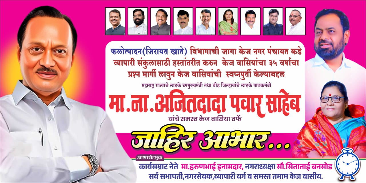 फलोत्पादन (जिरायत खाते) विभागाची जागा केज नगर पंचायत कडे व्यापारी संकुलासाठी हस्तांतरीत करुन केज वासियांचा ३५ वर्षाचा प्रश्न मार्गी लावुन केज वासियांची स्वप्नपुर्ती केल्याबद्दल महाराष्ट्र राज्याचे लाडके उपमुख्यमंत्री तथा बीड जिल्हायांचे लाडके पालकमंत्री मा. ना. अजितदादा पवार साहेब यांचे समस्त केज वासिया तर्फे जाहिर आभार.आभारोत्सुक कार्यसम्राट नेते मा. हरुणभाई इनामदार, नगराध्यक्षा सौ. सिताताई बनसोड सर्व सभापती, नगरसेवक, व्यापारी वर्ग व समस्त तमाम केज वासीय.