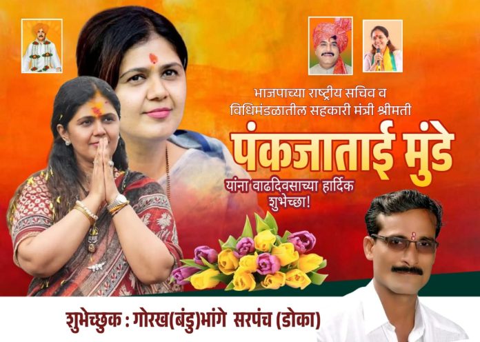 महाराष्ट्र राज्याच्या पशुसंवर्धन व पर्यावरण मंत्री नामदार पंकजाताई गोपीनाथराव मुंडे यांना वाढदिवसाच्या हार्दिक शुभेच्छा ! शुभेच्छुक:गोरख (बंडु)भांगे(सरपंच डोका)