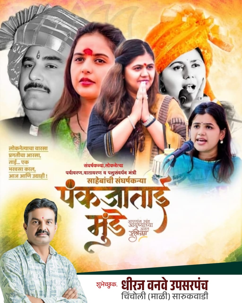 महाराष्ट्र राज्याच्या पशुसंवर्धन व पर्यावरण मंत्री नामदार पंकजाताई गोपीनाथराव मुंडे यांना वाढदिवसाच्या हार्दिक शुभेच्छा ! शुभेच्छुक:धीरज वनवे(उपसरपंच चिंचोली माळी/सारुकवाडी)