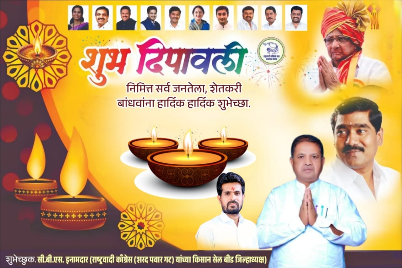 शुभ दिपावली निमित्त सर्व जनतेला, शेतकरी बांधवांना हार्दिक हार्दिक शुभेच्छा ! शुभेच्छुक. सी.बी.एस. इनामदार (राष्ट्रवादी काँग्रेस (शरद पवार गट) यांच्या किसान सेल बीड जिल्हाध्यक्ष)