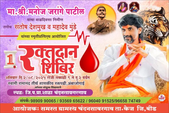 केज तालुक्यातील चंनसावरगाव येथे अठरापगड जाती बरोबर घेऊन चालणारा संघर्ष योद्धा मा .श्री. मनोज जरांगे पाटील यांच्या वाढदिवसानिमित्त चंदन सावरगाव येथे रक्तदान शिबिराचा मोठा कार्यक्रम आयोजित करण्यात आलेला आहे तरी आपली उपस्थिती दाखवून कार्यक्रमाची शोभा वाढवावी ठिकाण जिल्हा परिषद शाळा चंदन सावरगाव येथे वेळ ठीक सकाळी ९ ते ५ वाजेपर्यंत शिबिर चालू राहणार आहे या विषयी सविस्तर वृत्त असे की चंनसावरगाव येथे अठरापगड जाती बरोबर घेऊन चालणारा संघर्ष योद्धा मा .श्री. मनोज जरांगे पाटील यांच्या वाढदिवसानिमित्त चंदन सावरगाव येथे रक्तदान शिबिराचा मोठा कार्यक्रम आयोजित करण्यात आलेला आहे तरी आपली उपस्थिती दाखवून कार्यक्रमाची शोभा वाढवावी ठिकाण जिल्हा परिषद शाळा चंदन सावरगाव येथे वेळ ठीक सकाळी ९ ते ५ वाजेपर्यंत शिबिर चालू राहणार आहे असे आयोजकांनी सांगितले आहे.