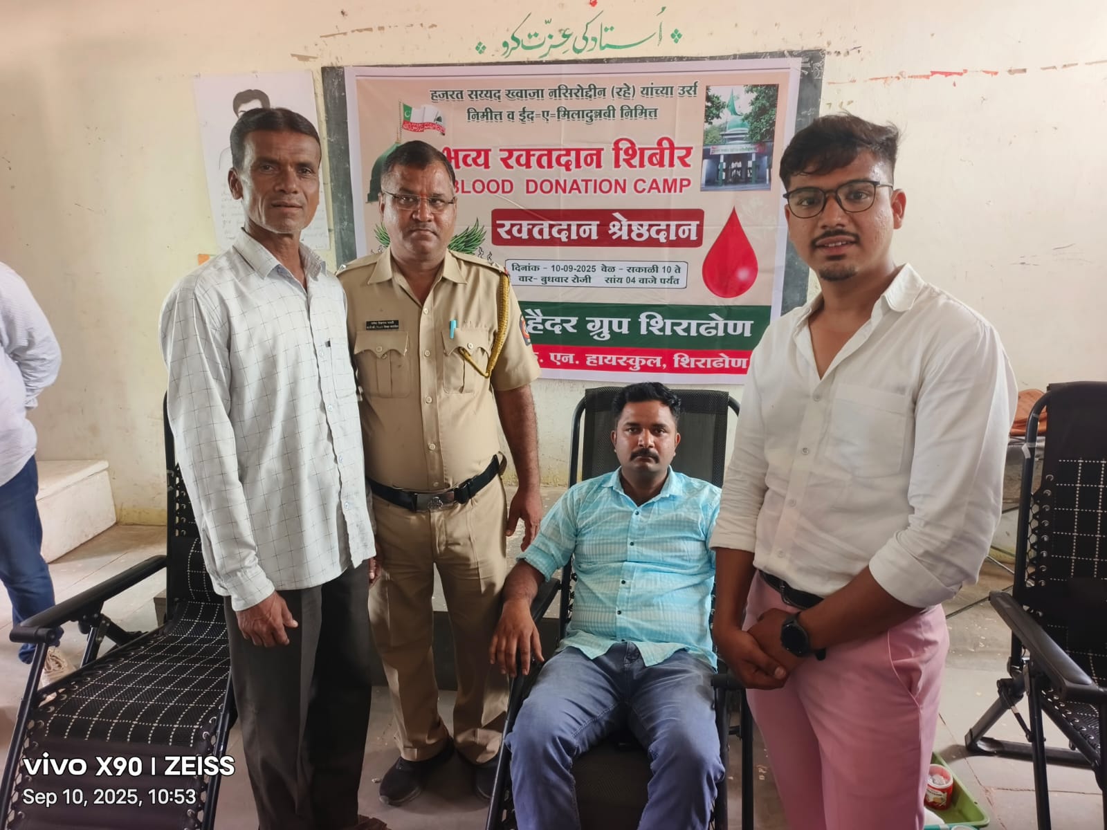 शिराढोण : कळंब तालुक्यातील शिराढोण येथील खाजा नसरुद्दीन उर्दू मराठी माध्यमिक प्रशाला येथे हैदर ग्रुपच्या वतीने भव्य दिव्य असे रक्तदान शिबिर आयोजित करण्यात आले होते त्या शिबिरामध्ये 101 रुग्णदात्यांनी रक्त देऊन आपले पवित्र असे दान दिले तसेच हैदर ग्रुपचे पदाधिकारी शिराढोण येथील मध्ये हजरत खाजा रहमतुल्ला आले यांच्या दर्गा परिसरात देवाची मिरवणूक होणार आहे हैदर ग्रुपचे अध्यक्ष आरिफ कुरेशी, उपाध्यक्ष अमिर डांगे, सोहेल शेख, फरहान पठाण, सोहेल मोमीन, तसेच परिसरातील पंचक्रोशीतील भावी भक्तांनी या कार्यक्रमाचा लाभ घ्यावा असे आव्हान करण्यात आले आहे.